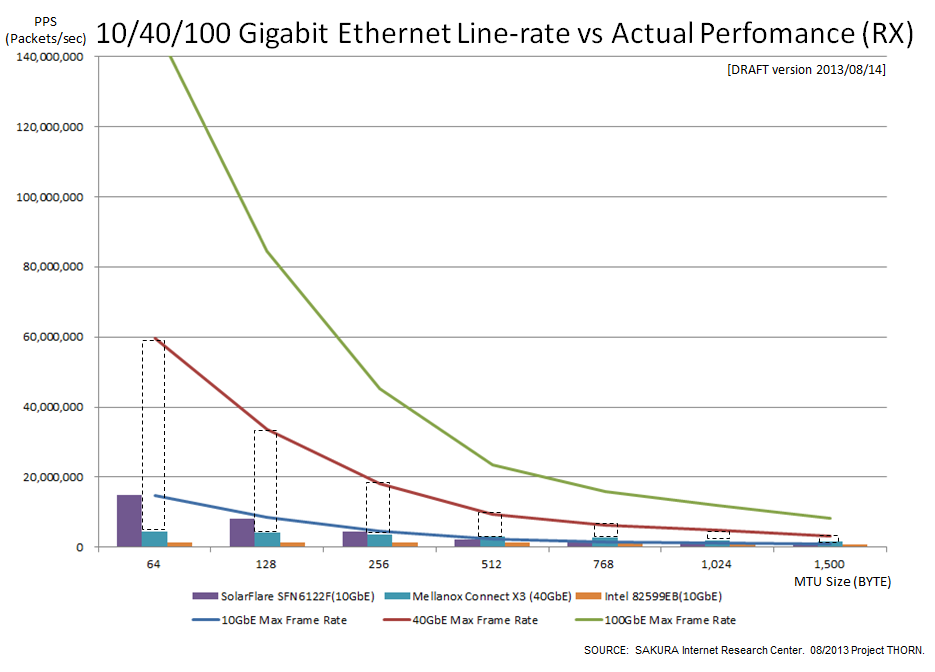 現在の調査結果では、主流となりつつある10 Gigabit Ethernetを超える帯域でネットワーク接続がこのまま行われた場合、サーバ単体でのパケット処理性能に限界が生じつつあり、これを補う仕組みが求められていることが分かります。