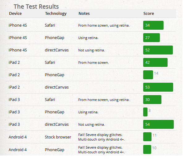 とくに、ここで紹介引用された「The Great HTML5 Mobile Gaming Performance Comparison by Ashley | 23rd, May 2012」は、見れば見るほど技術者として悲しい気持ちでいっぱいになります…