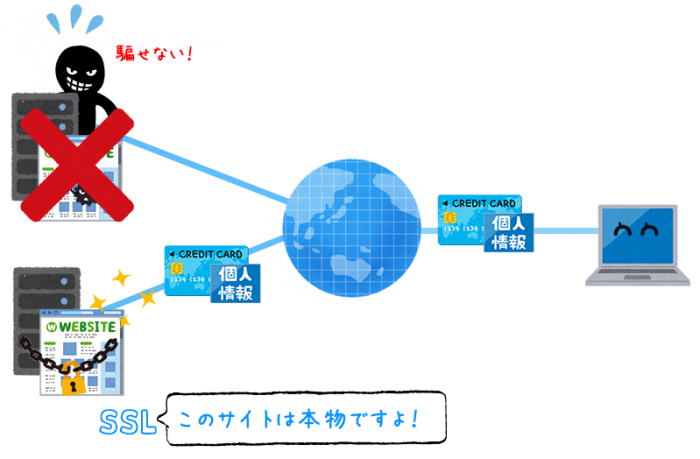 SSLにより通信が暗号化されることで、悪意ある第三者による通信の傍受(情報漏洩)や改ざん、なりすましを防ぐことができます。