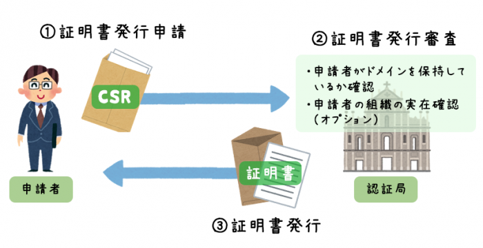 認証局は証明書が欲しい申請者の申請を受け付けて、その申請者がドメインを持っているかどうかを確認して、証明書を発行してくれます。これにより、自分がアクセスしているサイトはexample.jpだと保証された状態でサイト閲覧ができ、なりすましや改ざんを防ぐことができるわけです。