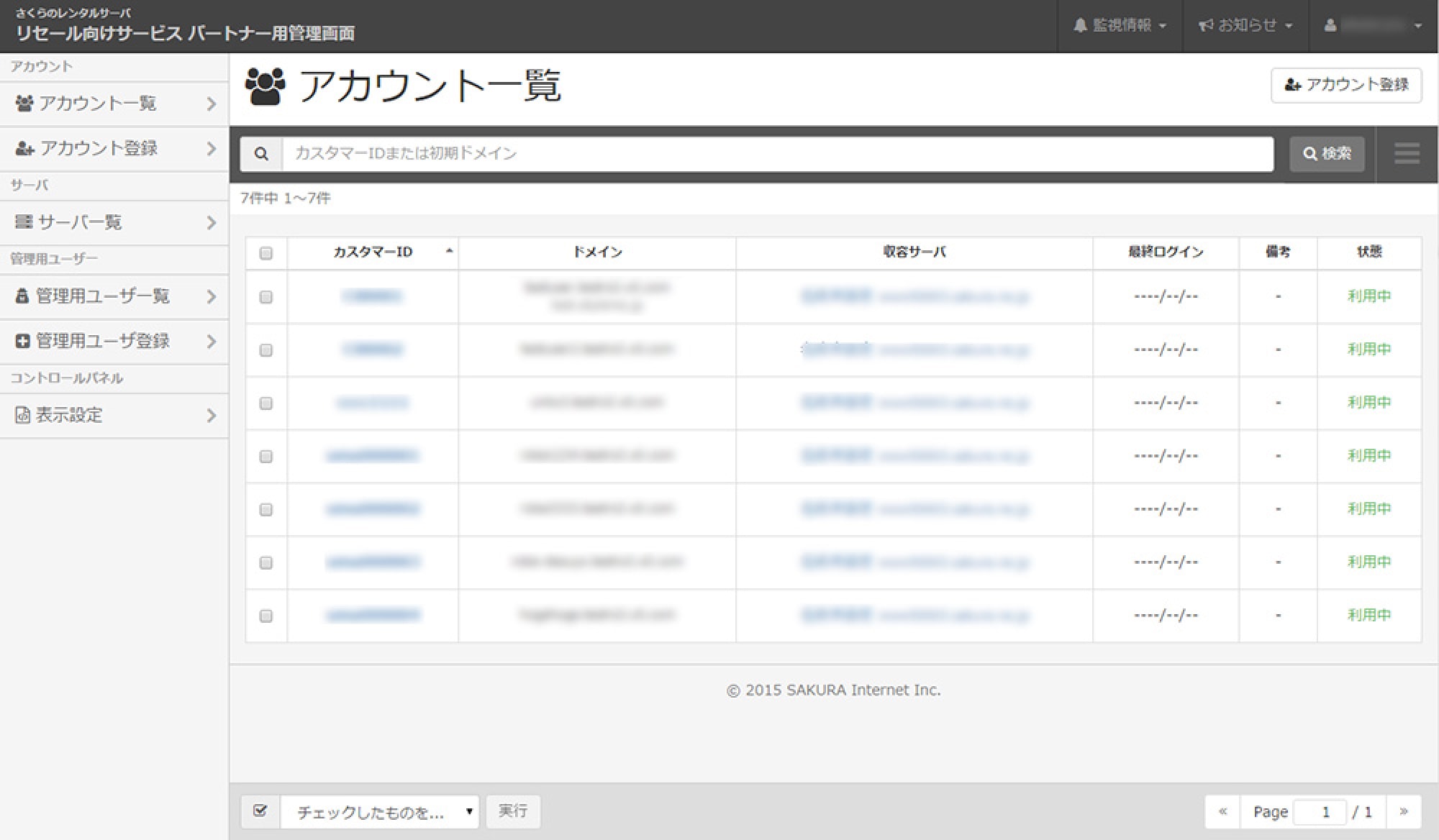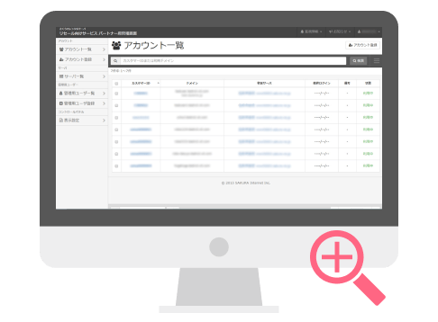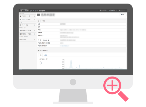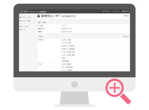 目的に合わせた多彩な管理が可能エンドユーザーのアカウント登録・停止・削除はもちろん、サーバモニタリング機能、APIキーの追加など、全て管理画面から簡単に行うことができます。