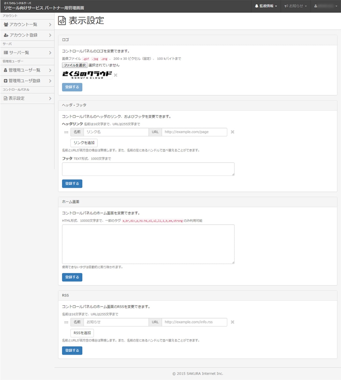 表示設定 エンドユーザーコントロールパネルのカスタマイズができます。
