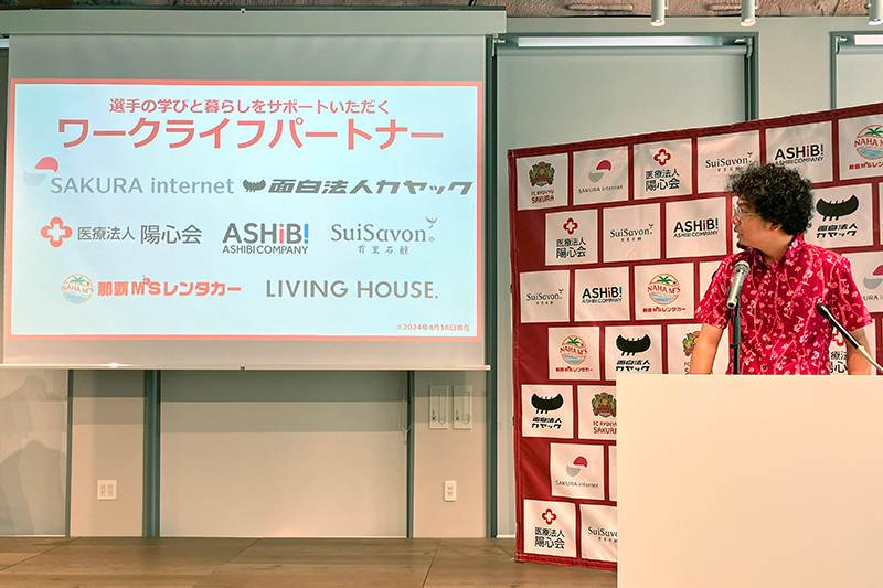 FC琉球さくらの選手たちは、昼間は働き、夕方からサッカーの練習をする二刀流生活をおくっています。そこでサッカーの競技面だけでなく、選手のセカンドキャリアを見据えた生活面や社会貢献活動を企業にサポートしていただきます。通常のスポンサー制度とは違い、競技面だけではなく、衣食住といった生活面や引退後のセカンドキャリアなど、彼女たちの人生そのものを応援していただく制度です。カヤック、さくらインターネットを含め、沖縄への熱い思いに溢れる県内外の7社(※5月末時点:9社)と契約を締結しています。今後も、ともに沖縄の未来をつくってくださる企業を募集しておりますので、ぜひご参加よろしくお願いいたします。