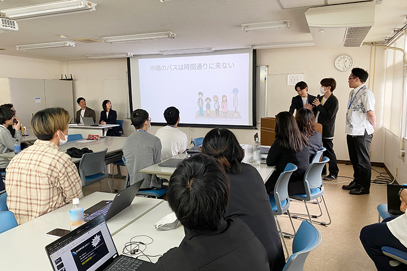 4チームが順に、各10分の持ち時間内で発表。沖縄在住の学生ならではの視点で作られたアイデアが披露されました。チームの垣根を乗り越えて前のめりに聞き入ったり、ときには笑いも起きたりと、緊張感がありつつも和やかな雰囲気で発表が進んでいきました。審査員からの質問には臨機応変に答え、思いもよらなかった指摘にたじたじになりながらも、各チーム堂々と発表を終えることができました。