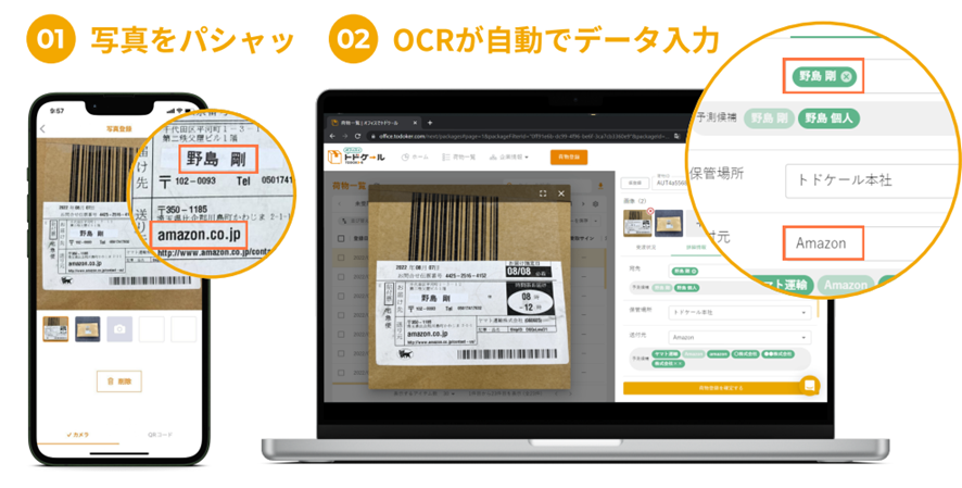 「トドケール」の使い方は簡単。専用アプリから写真を撮って画像をシステムに取り込めば、自動で宛先などの文字を認識し、データが反映される。荷物が登録されると、宛先の社員の連絡先(メールやチャット)へ自動で通知が送られる。
