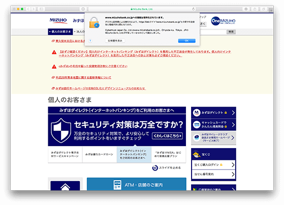 現在、日本の銀行サイトの多くは、トップページや金融商品の紹介ページは非SSLサイトとして提供し、オンラインバンキング機能のページのみSSL化されているところがほとんどです。