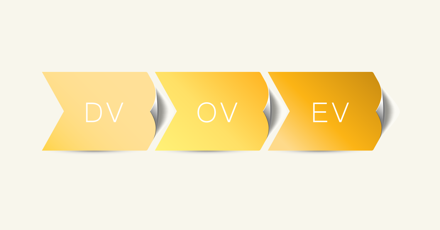 SSLサーバー証明書は、認証レベルにより「ドメイン認証」「企業認証」「EV認証」の3つに分けられます。ドメイン認証は、ドメイン名の所有権のみを確認し、企業認証は、ドメインの所有権に加え、申請した組織の実在性を確認します。最も厳格に審査するEV認証では、登記簿謄本や第三者機関のデータベース等により法的・物理的に組織の実在性を確認することで、高い信頼性を実現します。なお、3つの認証方式で証明書自体の機能(暗号強度など)には差がありません。証明書の発行申請者をどのように審査するかによって種類が異なります。