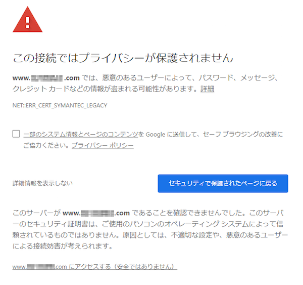 この”最終的な提案”により、特定の期間に発行された旧シマンテック社のSSL証明書の失効対応がChromeブラウザにて段階的に実施されている状況です。10月にリリースされるChrome70では、該当するSSL証明書を利用しているサイトにアクセスした場合、エラーが表示されてサイトが閲覧できなくなります。