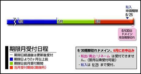 期限月前月26日(転入)または21日(転出、廃止)以降から期限月当月にお申込み頂いた場合、全ての作業はドメイン期限日迄に完了させることはできません。