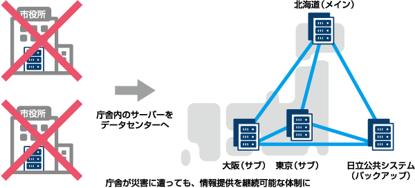 現在の4Uweb/CMSの主要なシステム構成は、自治体から離れた北海道をメインに、大阪や東京をサブ、日立公共システム本社のデータセンターにもバックアップを用意し、ハードウェアと回線を多重化した形になっています。データセンターが国内に3 拠点あることで、自治体の地域によって分散のさせ方を調整できることもメリットです。また、「一般のクラウドサービスは集合住宅で、うちは一戸建てになります」(坂野氏)と説明することで、クラウドキーワード先行の方にうまく違いを理解していただいたり、ハードウェアの物理独立が要求仕様になっている案件に対応できています。