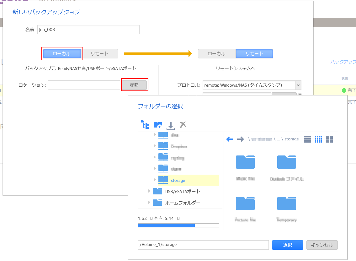 参照をクリックしバックアップを取得するフォルダを選択します。