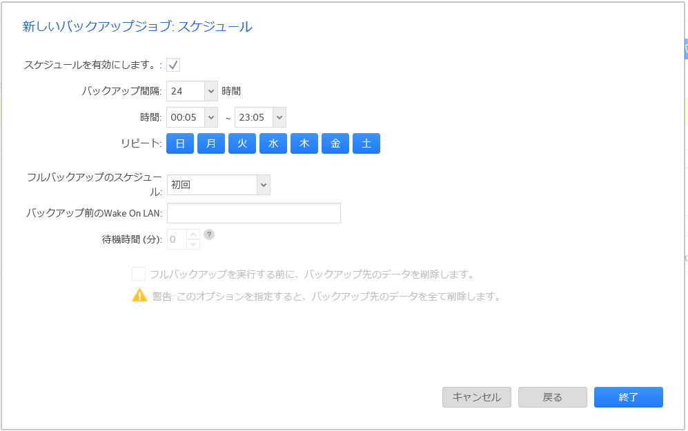 バックアップ間隔や時間を設定し、終了をクリックします。