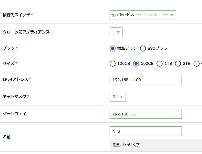 続いて接続するNFSアプライアンスをNFSアプライアンスの作成のページを参考に作成します。