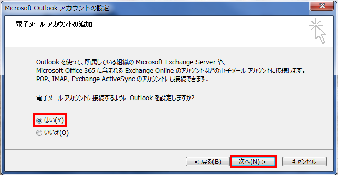 1電子メール アカウント追加 画面で『 はい 』にチェックをいれ、 『 次へ(N) 』をクリックします。