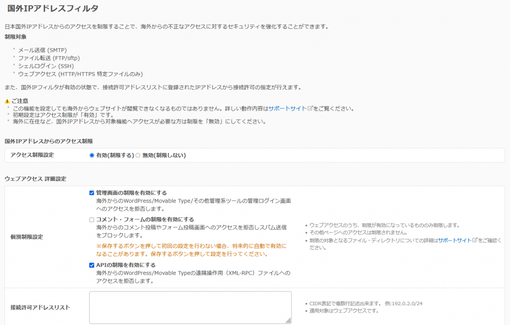 海外からのコメント投稿やフォーム投稿画面へのアクセス制限の設定ができます。