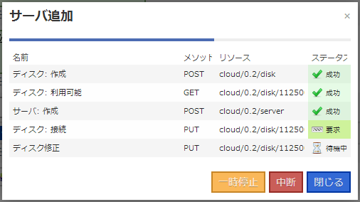 全ての設定が完了したら右上の「作成」ボタンをクリックします。開始後数分でサーバの作成が完了します。
