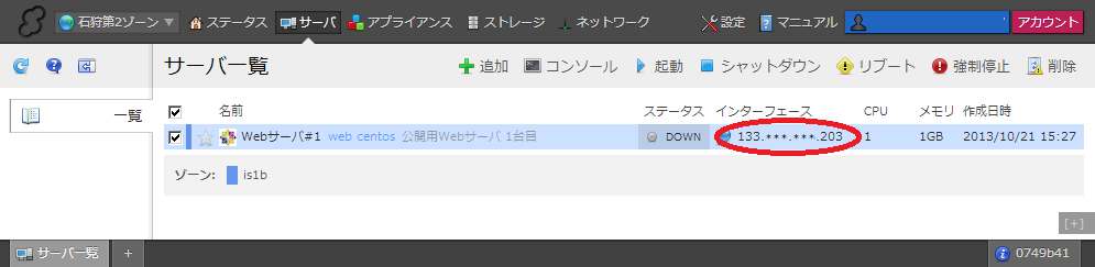 それではサーバにログインしてみましょう。サーバ一覧には作成したサーバが表示され、「インターフェース」のカラムに自動的に割り当てられたIPアドレスが表示されている事を確認してください。