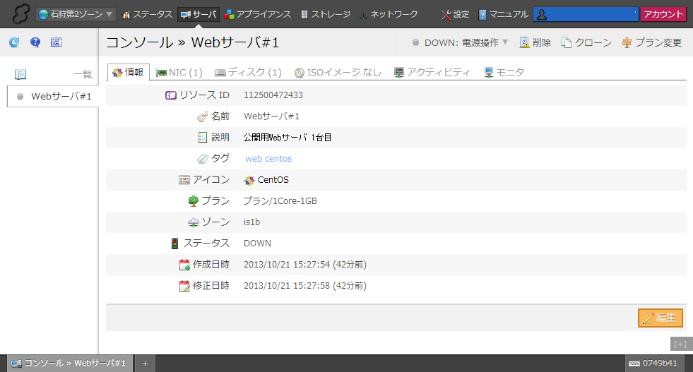 サーバ一覧をダブルクリックするとサーバの詳細画面が表示されます。ここではサーバの情報の閲覧・編集や、NICやディスクの追加、サーバプランの変更などが行えます。