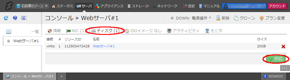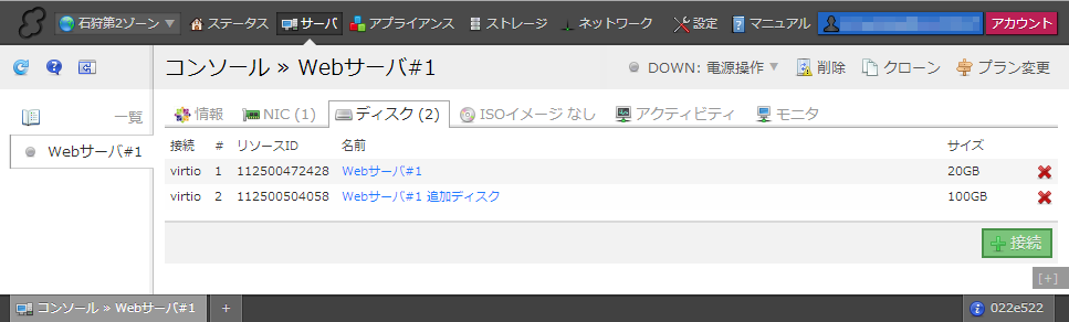 今回作成したディスクをサーバに接続します。サーバ詳細画面より「ディスク」タブを開き、右下の「接続」ボタンをクリックします。