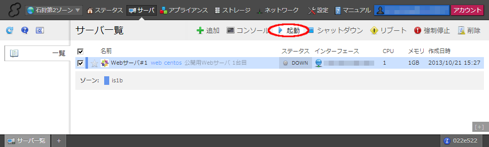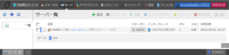 シャットダウン操作後、サーバ一覧画面でサーバのステータスが「DOWN」になっていることを確認してください。