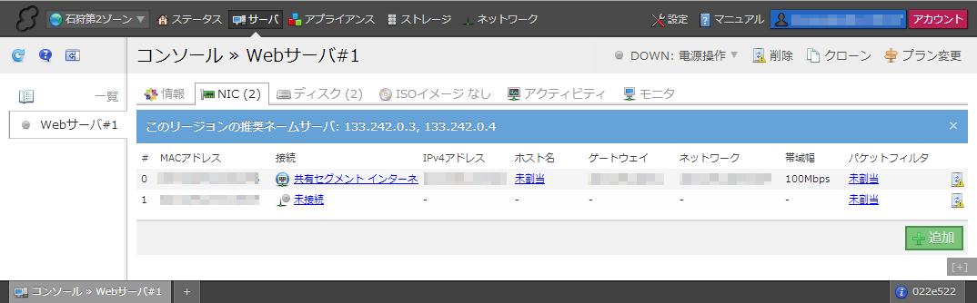 サーバ一覧画面を表示します。対象サーバのステータス欄が「DOWN」の表示となっていることを確認後、「NIC」タブを選択します。ここでは現在サーバに接続されているNICの一覧が表示されます。今回は新たなNICの取付を行うので、右下の「追加」ボタンをクリックします。