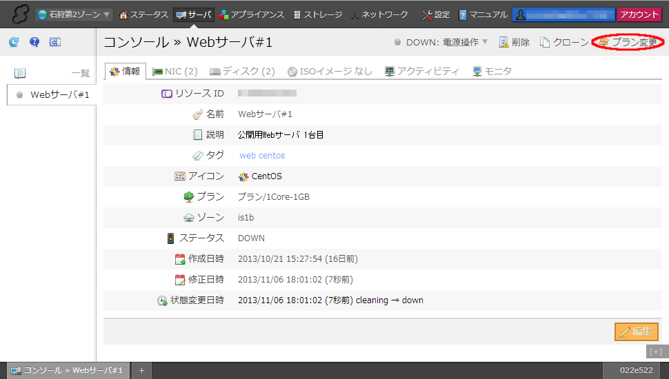 サーバのリストからサーバを選択し、詳細画面を開きます。右上に「プラン変更」ボタンが表示されるので、このボタンをクリックします。