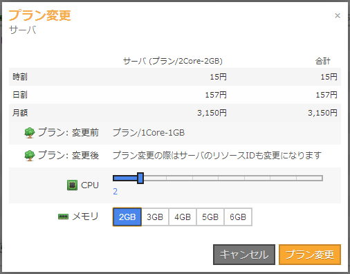 プラン変更後のCPU個数、メモリ数を選択するダイアログ画面が表示されるので、それぞれ変更したい値を指定し、「プラン変更」ボタンをクリックします。