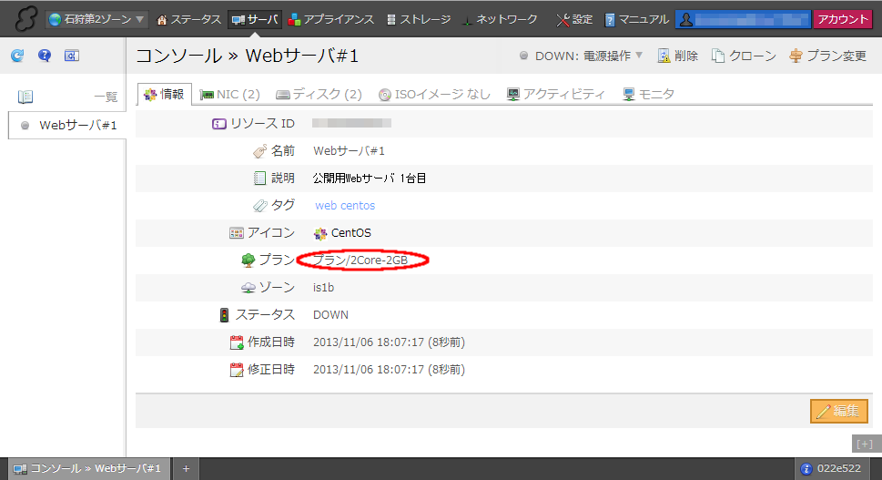 プラン変更操作が完了したら、サーバの情報画面でCPU個数、メモリ数が変更されていることを確認できます。