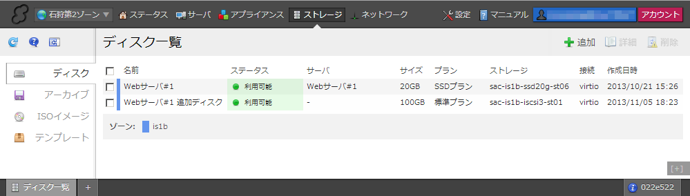 画面上部メインメニュー内の「ストレージ」をクリックすると、メイン画面に「ディスク一覧」が表示されます。この一覧画面では、サーバにアタッチ(接続)された状態のものを含め、現在のアカウントで作成済みのディスクがすべて表示されます。