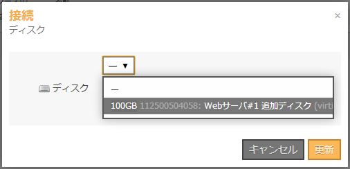 接続したいディスクの選択画面が表示されるので、今回作成したディスクを選択し「接続」ボタンをクリックします。