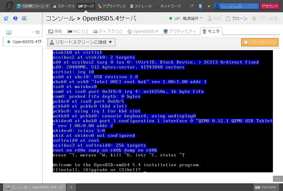 サーバの作成と起動が完了したら、「モニタ」画面よりインストールを進めていきます。