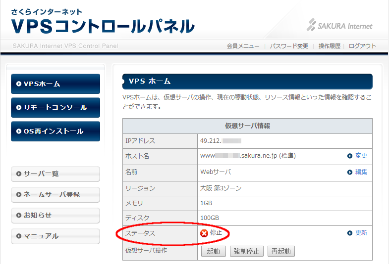 さくらのVPSサーバのシャットダウン操作後、さくらのVPSのコントロールパネルからサーバが停止状態にあることを確認します。