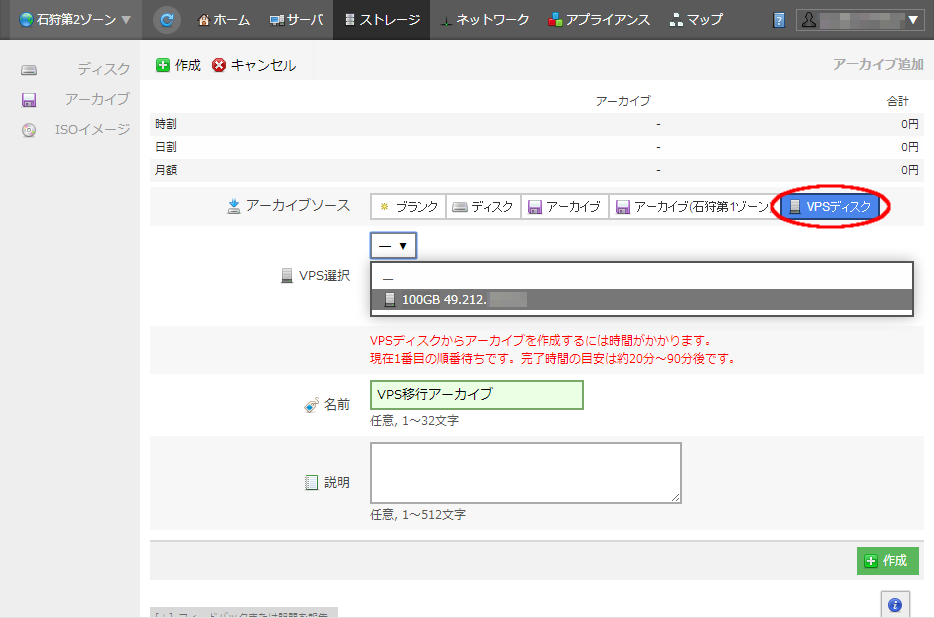 アーカイブ追加画面では、「アーカイブソース」で「VPSディスク」ボタンをクリックします。すると下の「VPS選択」ポップアップメニューに、現在コントロールパネルにログイン中の会員IDが持つVPSサーバが選択できるようになります。ここで、アーカイブに移行したいサーバを選択します。「名前」欄や「説明」欄には必要に応じて適宜記入し、「作成」ボタンをクリックします。