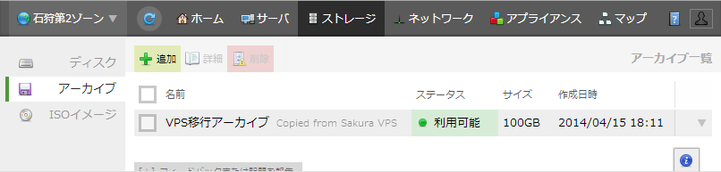 まず、メインメニューより「ストレージ」をクリックし、続いて左側のサイドメニューより「アーカイブ」をクリックします。今回は新たにさくらのVPSからのディスク移行となるため「追加」ボタンをクリックします。