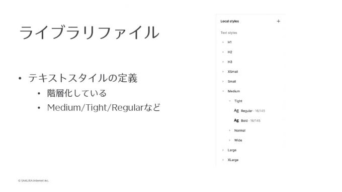 例えば、テキストスタイルの定義を階層化しています。テキストスタイルとして「H1」、「H2」、「H3」の3つと文字の大きさを「XSmall」、「Small」、「Medium」、「Large」、「XLarge」の5つ用意し、文字の大きさに対し、行高には「Tight」、「Normal」、「Wide」の3つ、さらに、フォントウェイトには「Reguralr」、「Bold」の2つを用意した形で定義しています。