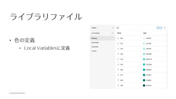 また、色の定義をFigmaの「Local Variables」という機能を使って、各名前のトークンと具体的なカラーコードを定義しています。