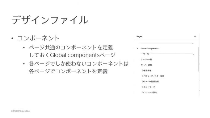 これらのライブラリで定義したコンポーネントを使用して各画面のデザインを作成します。ページ共通のコンポーネントは「Global components」ページで、各ページでしか使わないコンポーネントは、各ページ内で定義しています。例えば、サーバー一覧でしか使わないコンポーネントは「サーバー一覧」のページ内で定義し、各画面のデザインでコンポーネントを使うという形で運用しています。