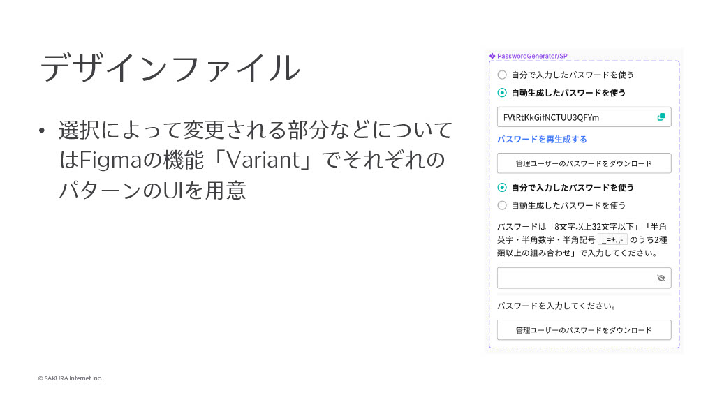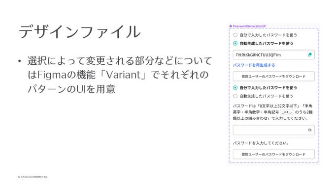 選択によって変更される部分には、「Variant」というFigmaの機能を用いて、それぞれのパターンのUIを用意しています。上図の「PasswordGenerator」というコンポーネントには、自分で入力したパスワードを使う選択肢と自動生成したパスワードを使う選択肢の2つがあります。選択肢を切り替えると下の部分のUIが切り替わるコンポーネントですが、UIをそれぞれに用意して、実際の画面上で簡単に切り替えて、この選択を変えた時に、どのような変化があるかを定義しています。