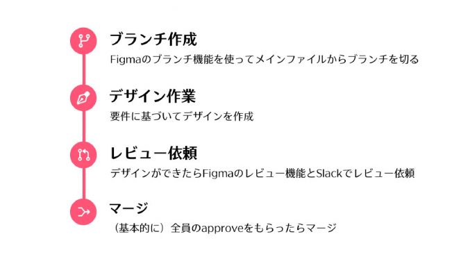 デザイン作業を開始する場合、最初にブランチ機能を使用してメインファイルからブランチを切ります。次に、要件に基づいてデザインを作成します。デザインが完成したら、Figmaのレビュー機能とSlackを活用して、チームメンバーにレビューを依頼します。