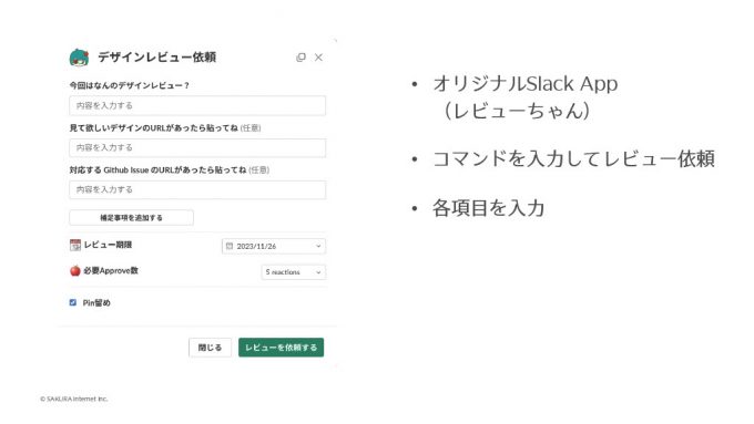 Slackでのレビュー依頼には、オリジナルのSlack Appである「レビューちゃん」を使用しています。このAppは、/reviewコマンドを入力することでレビュー依頼が可能です。具体的には、コマンドを入力するとモーダルウインドウが表示され、デザインレビューに必要な項目を漏れなく記載できます。項目としては下記3つがあります。