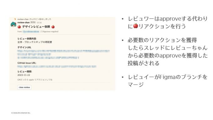 レビュアーは、デザインのURLやGitHub IssueのURLを確認し、どのような内容のレビューを行うべきかを確認します。OKの場合はapprove、コメントがある場合はFigmaかSlackにコメントしてレビューを行います。approveの場合、レビュアーは🍎(りんご)のリアクションを行います。例えば、上図のように、3つのapproveが必要な場合、3つの🍎(りんご)を獲得したら、「必要数のapproveを獲得した」とレビューちゃんからの投稿があります。これを見たレビュイーはFigmaのブランチをマージする流れになります。