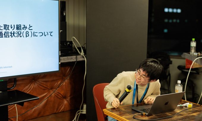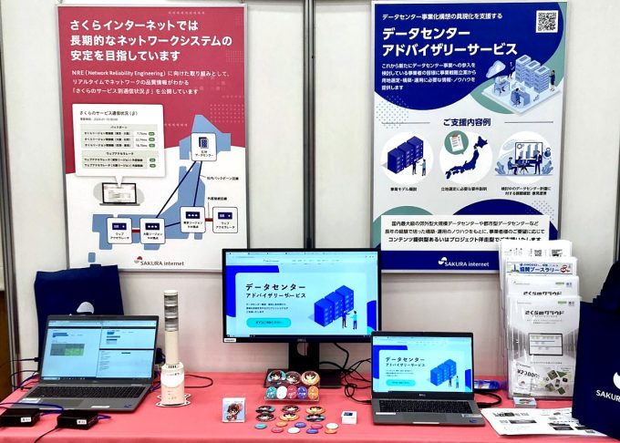2024年1月17日(水)〜19日(金)に開催されたJANOG53において、当社のブースにて本プロジェクトの展示を行いました。上の写真が展示ブースで、左側が本プロジェクトの展示になっています。拠点に置いているエージェントと同じものを展示ブースにも設置し(写真左下に見える黒い小さい箱)、当社の拠点との間の通信状況をご覧いただきました。エージェントは有線LANで接続しているので、ケーブルを抜くともちろん通信断になります。そういったところもご覧いただきました。