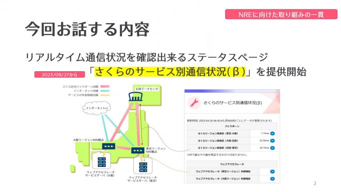 内容を最初にさらっとお話しさせていただきますと、まずリアルタイムの通信状況を確認できるステータスページを、2023年9月27日から「さくらのサービス別通信状況(β)」ということで提供開始しました。図の右側の部分がそれですね。こういったものをβ版ですが提供を開始いたしました。このシステムの中身や、この取り組みの背景といったところが発表内容になります。