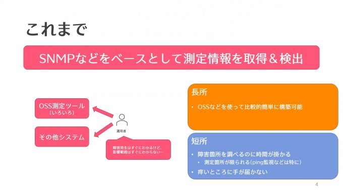 まずこれまでどういったことをやっていたかというと、SNMPなどをベースに測定情報の取得や検出をしていました。どこの会社さんでも、SNMPだけだけじゃなくてICMPでpingを飛ばしたりとか、OSSの測定ツールでZabbixとか、他にもいろいろ良いツールがあると思うんですけど、そういうツールを使っていると思います。うちの社内にも昔から歴史的な理由で使われ続けているシステムがいろいろとあります。