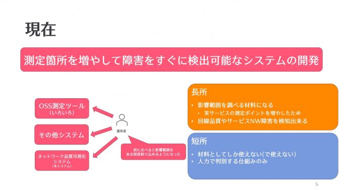 そこで今回のツールを作ったことで何が変わってきたかっていう話です。測定箇所を増やして障害をすぐに検出できるシステムを作ろうということで、その一環としてネットワーク品質可視化システムを今回開発しました。