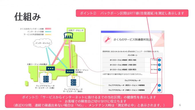 まず、「さくらのサービス別通信状況」というものをβ版で出させていただいてるんですけれども、これはサービスからインターネットに抜けるまでの当社ネットワークの健康性を表示したりとか、バックボーン区間のRTT、例えばpingを打って何msecとかって出てくると思うんですけど、そういった往復遅延の値を測定していて、それを表示しているものになります。