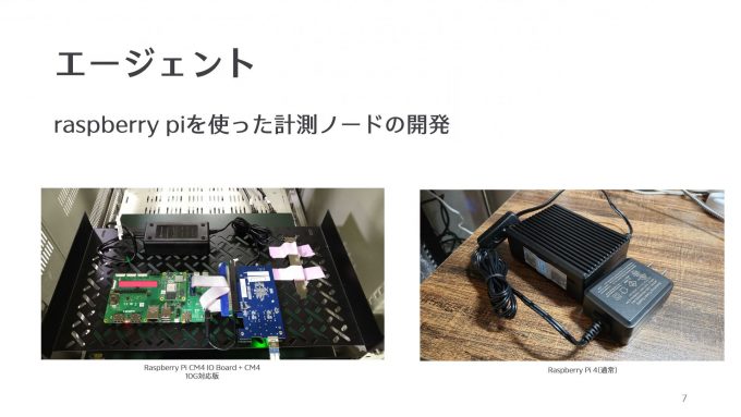 続いてエージェントの中身を紹介します。機器としてはRaspberry Piを使用しています。スライドの右側がRaspberry Pi 4で、左側はRaspberry Piの10Gbps対応版です。最近のルータは10Gしかついていないものがあったり、イーサネットがついていないルータも多いんで、そういったニーズにも対応できるように、こういった機器を使ってエージェントを作って設置しました。これ以外にも実は普通の1Uのサーバを使ったりもしています。