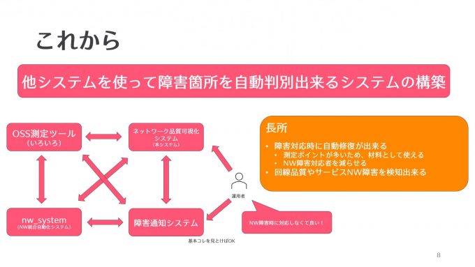それで、こういった仕組みを作ったのはいいんですけど、これからはこれをもっと多用して、他のシステムとも連携して障害箇所を自動的に判別できるようなシステムを作れればと思っています。先ほどお話ししたように、現状ではまだ判断材料にはなるけどすぐに障害かどうかまでは判別できないという短所があるので、それを解決するためのソリューションをこれから作っていきたいと思っています。マイクロサービス的なものを作って、マイクロサービス同士で通信して、そこからシステムの方で自動的に判別して、ネットワーク障害が起きたときにここがダメですよとかここは正常ですよとか、そういったものをこれから作っていければというところで現在進行しているところです。