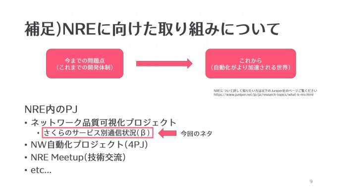 最後に、当社におけるNRE(Network Reliability Engineering)に向けた取り組みについて説明します。