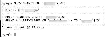 mysql> SHOW GRANTS FOR 'ユーザー名'@'%';